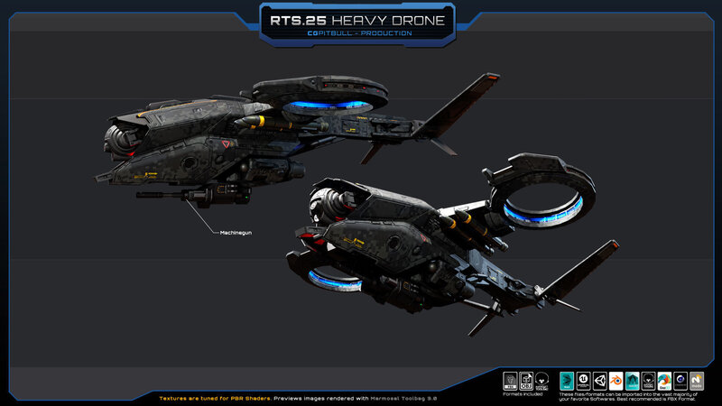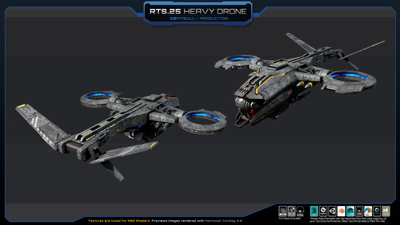 Set of one RTS.25 - Heavy Drone (FBX model). Separated parts: weapons, engines, sensors (NO landing gear included). No animated parts, FX, script or LOD. Check all previews, descriptions and video for full details before buying. (HANGAR in video and previews is NOT included, its just for Artistic purpose).