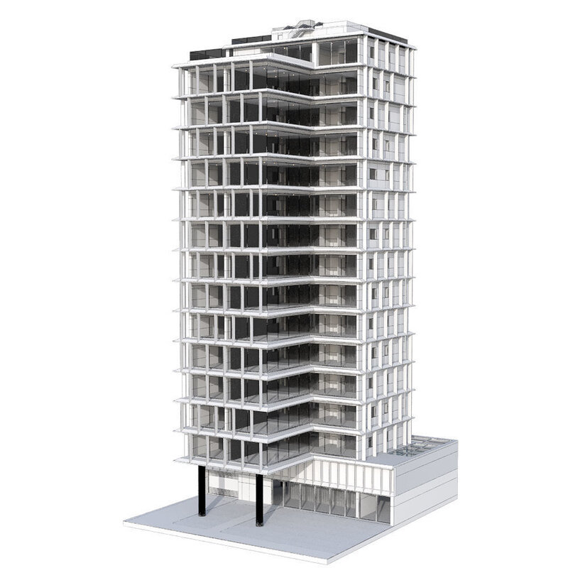 Modern building with usable interiors. All wooden slats, both internal and external, have Corona Randomizer that makes it very easy to randomize color and uvw direction. Despite the size, the file is not heavy to work with. All textures are in Corona legacy so they can be used in previous versions of corona however as it has materials using Corona uvw randomizer it would be ideal to be used from Corona 6.