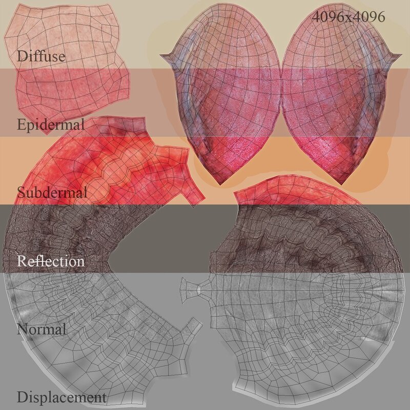 - Model utilizes normal and displacement maps and mental ray subdivision approximation.